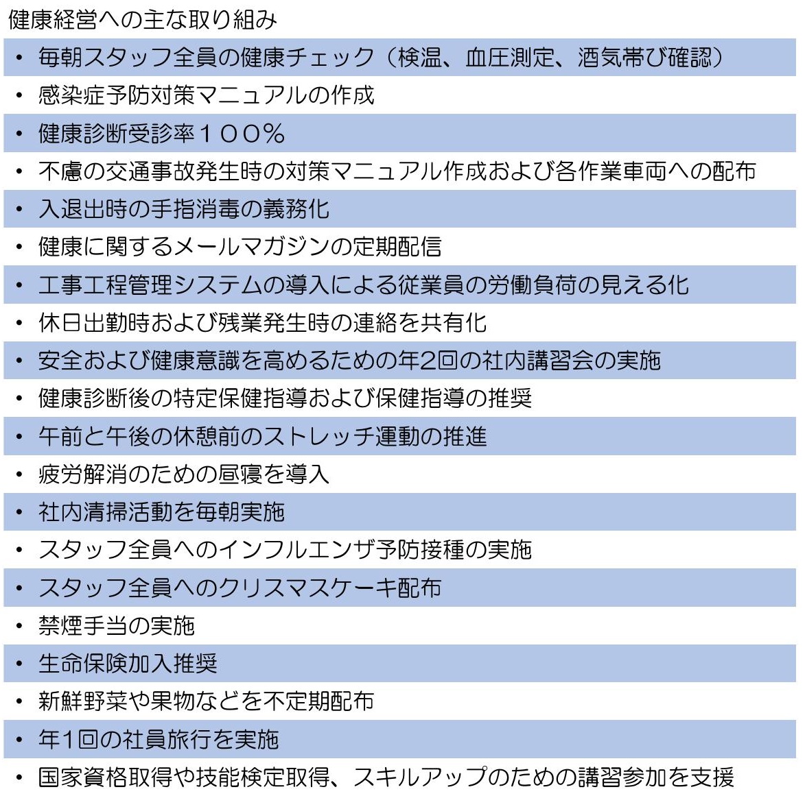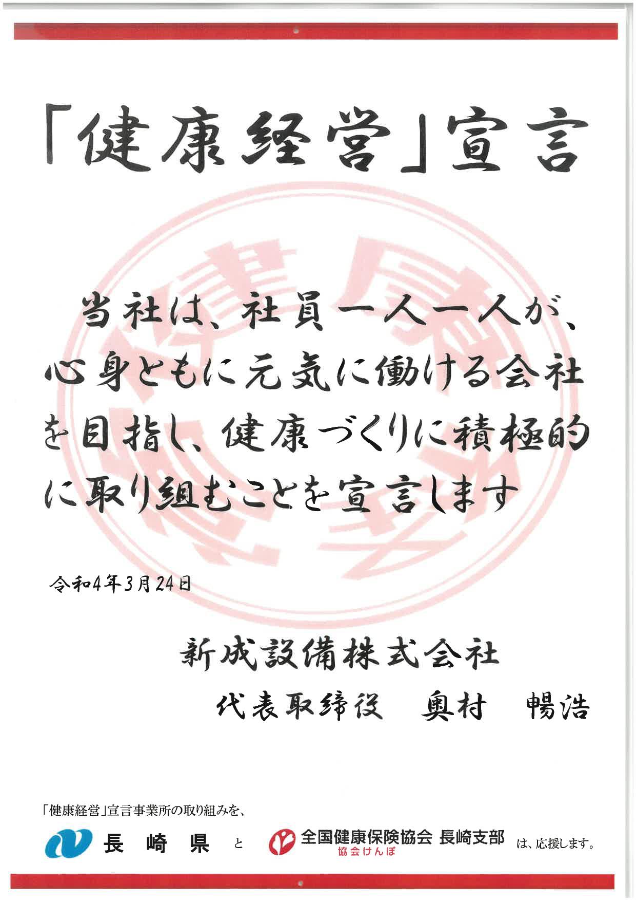 新成設備は、スタッフ一人ひとりの健康を尊重し、安全で快適な職場づくりの実現を図ります。私は、先頭に立ち、健康増進につながる行動を取り組みを実施するとともにスタッフ全員が心身ともにいきいきと働ける健康づくりを積極的に推進することができるよう、ともに取り組みます。